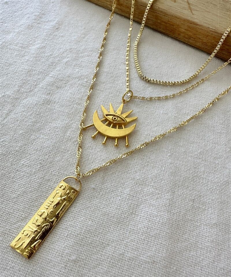Orta katmandaki koruyucu göz, alt katmandaki Mısır esintili dik plaka ve üst zincirin sadeliği; seni hem görünümünde hem enerjide dengede tutar.